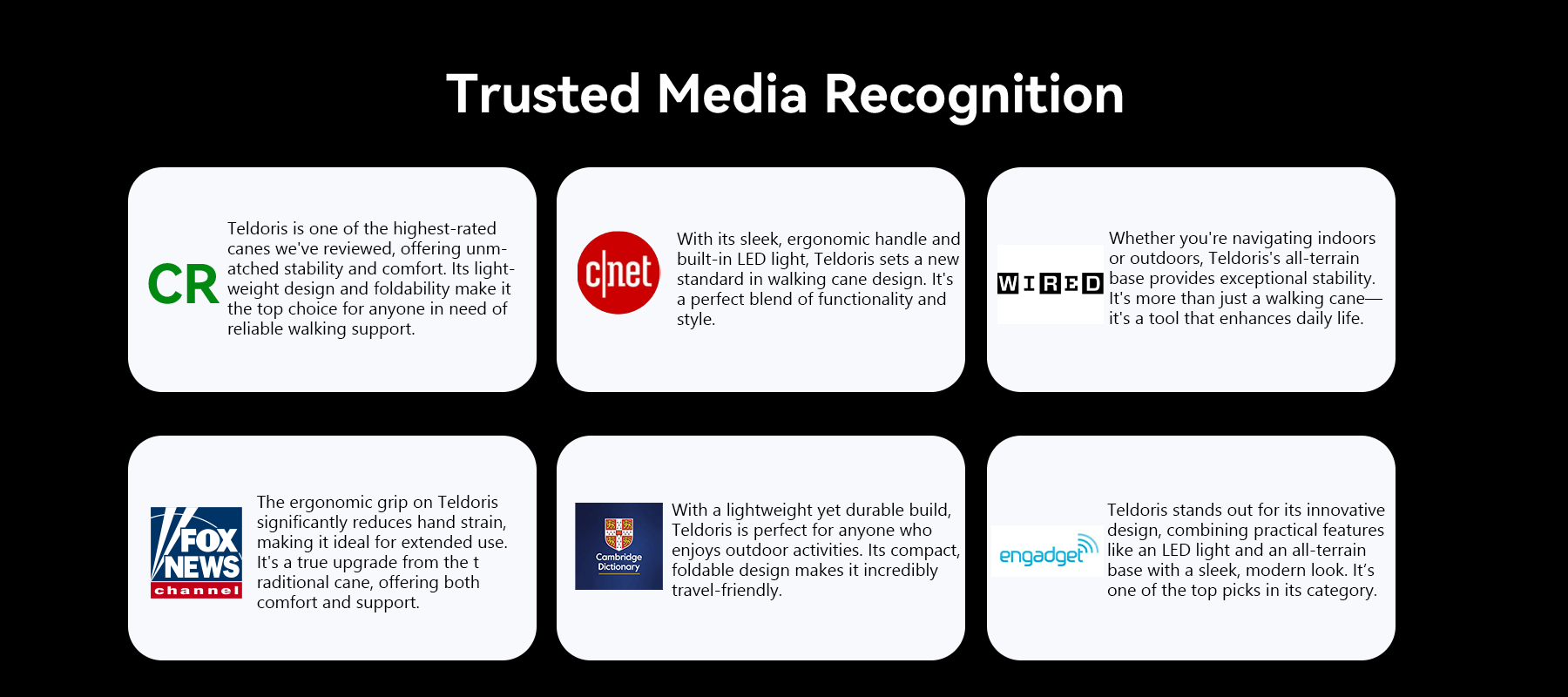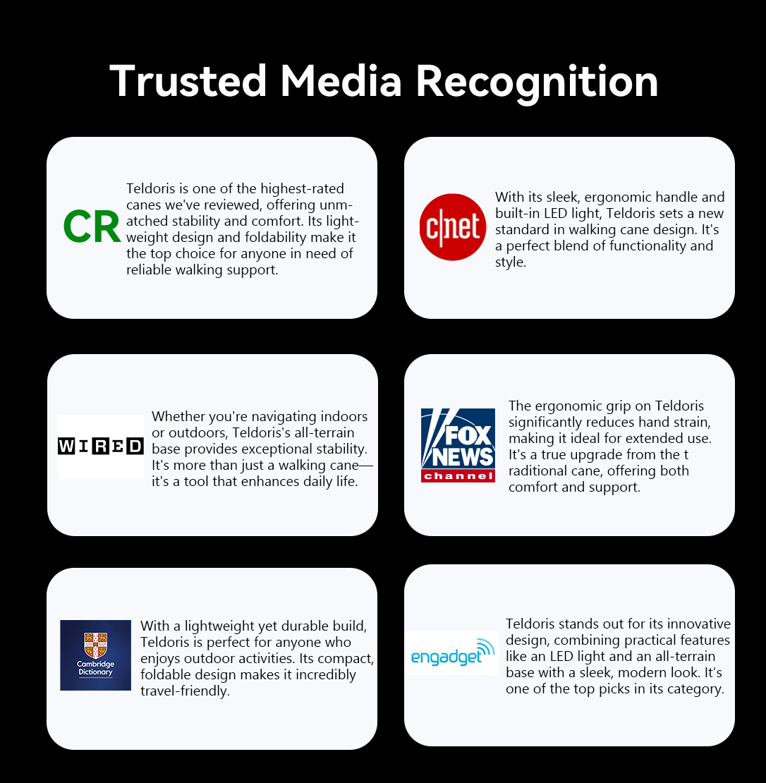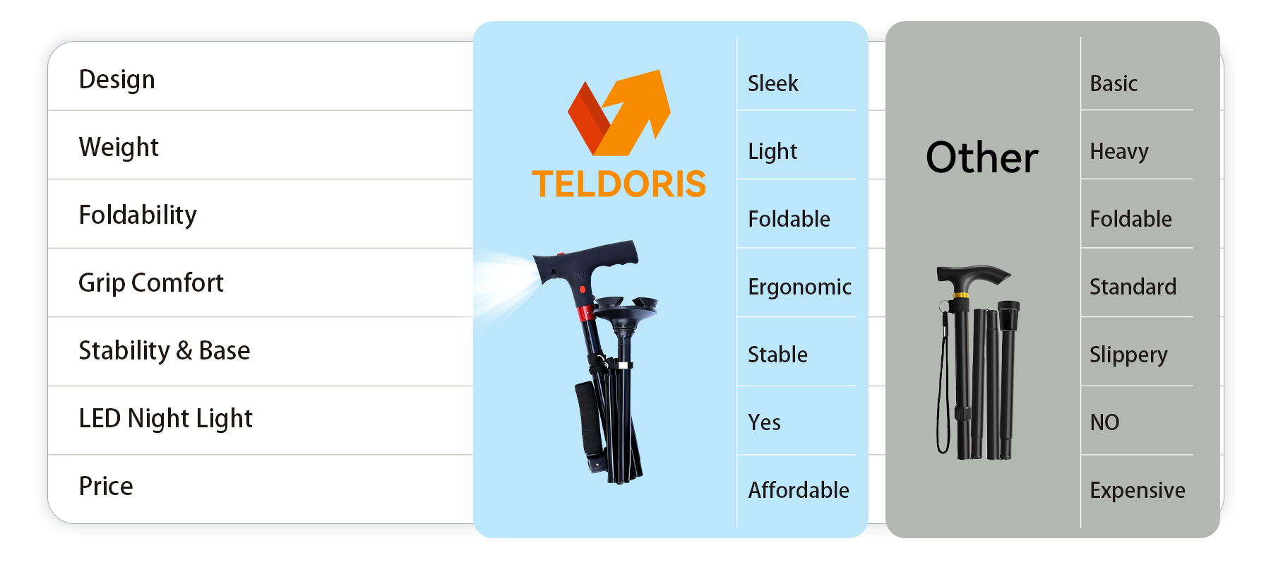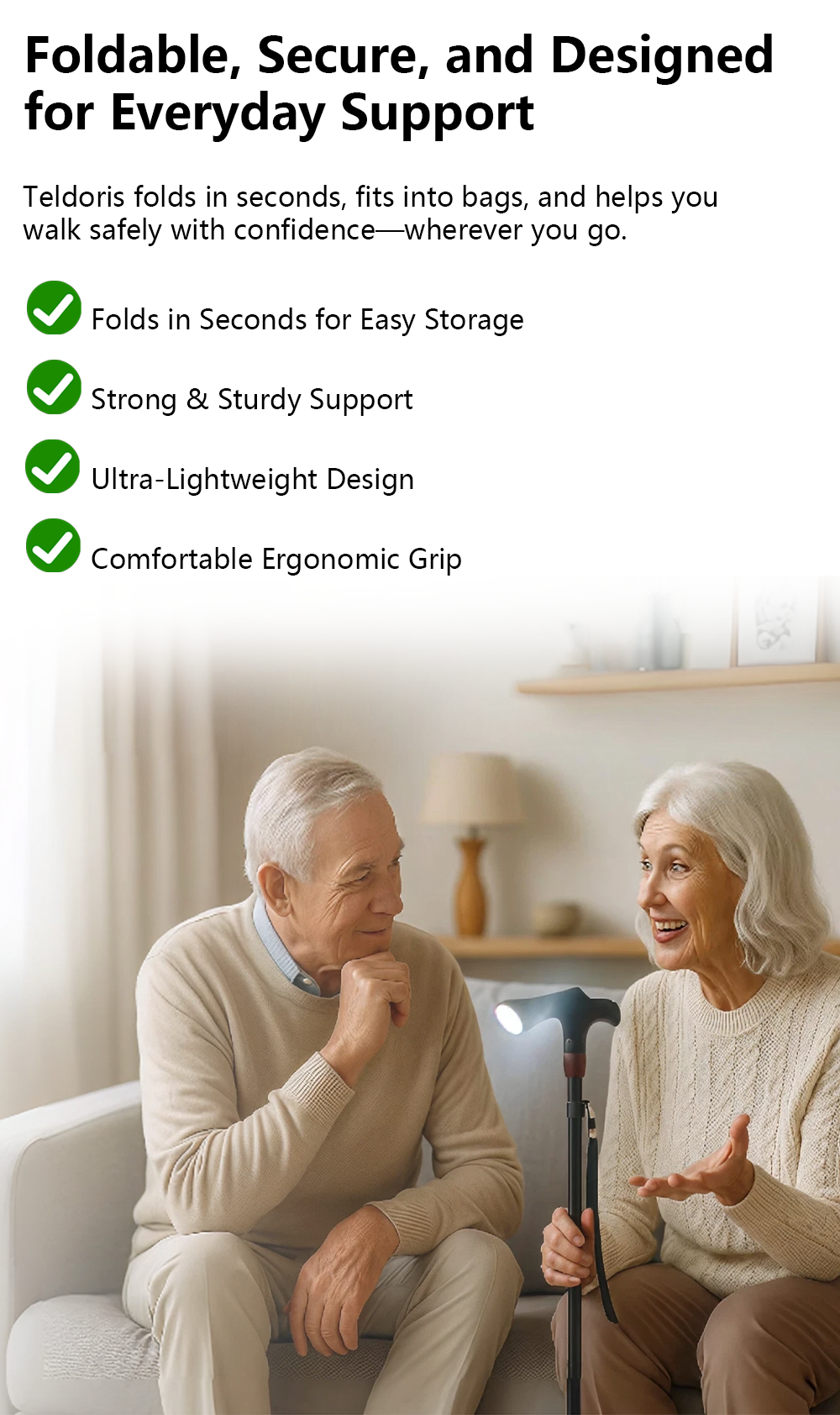 Teldoris designs lightweight, foldable canes with ergonomic grips, sturdy all-terrain bases, and built-in LED lights. Each cane is made to help you walk with confidence and ease — offering stability, comfort, and peace of mind wherever you go.