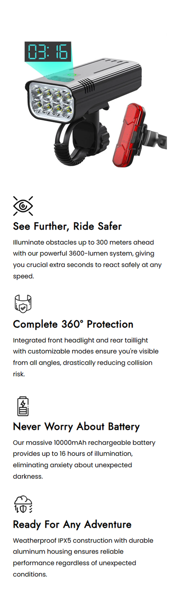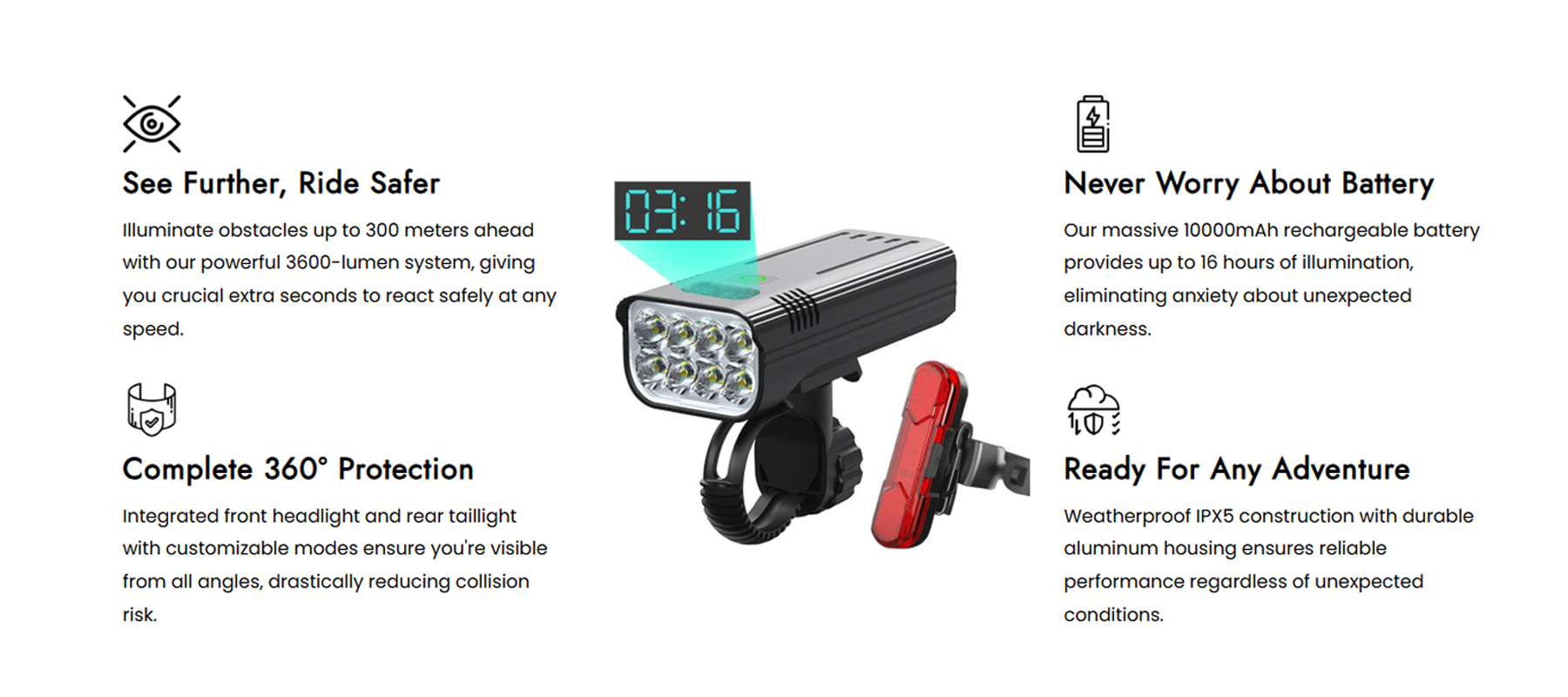 Harnessing the immense power of 3600 Lumens, the Teldoris bicycle light illuminates your path with an ultra-long and expansive beam. This ensures a clear, comprehensive view of the road ahead, eliminating blind spots so you can anticipate every hazard and maintain absolute control over your ride.