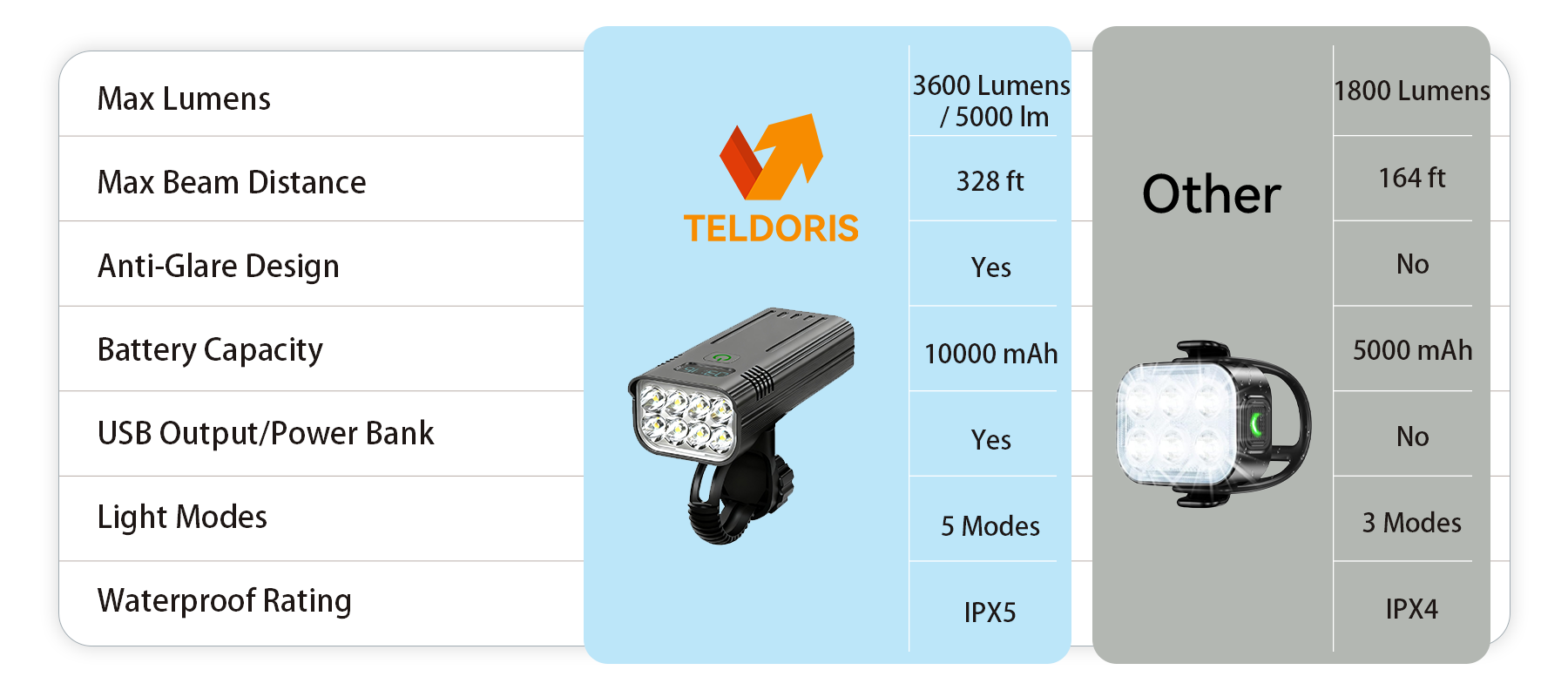 Teldoris prioritizes portability, user-centric design, and reliable performance. Core features include ultra-bright illumination, multiple lighting modes, long-lasting battery, and USB output – enabling safe, versatile, and convenient lighting for every ride, day or night.