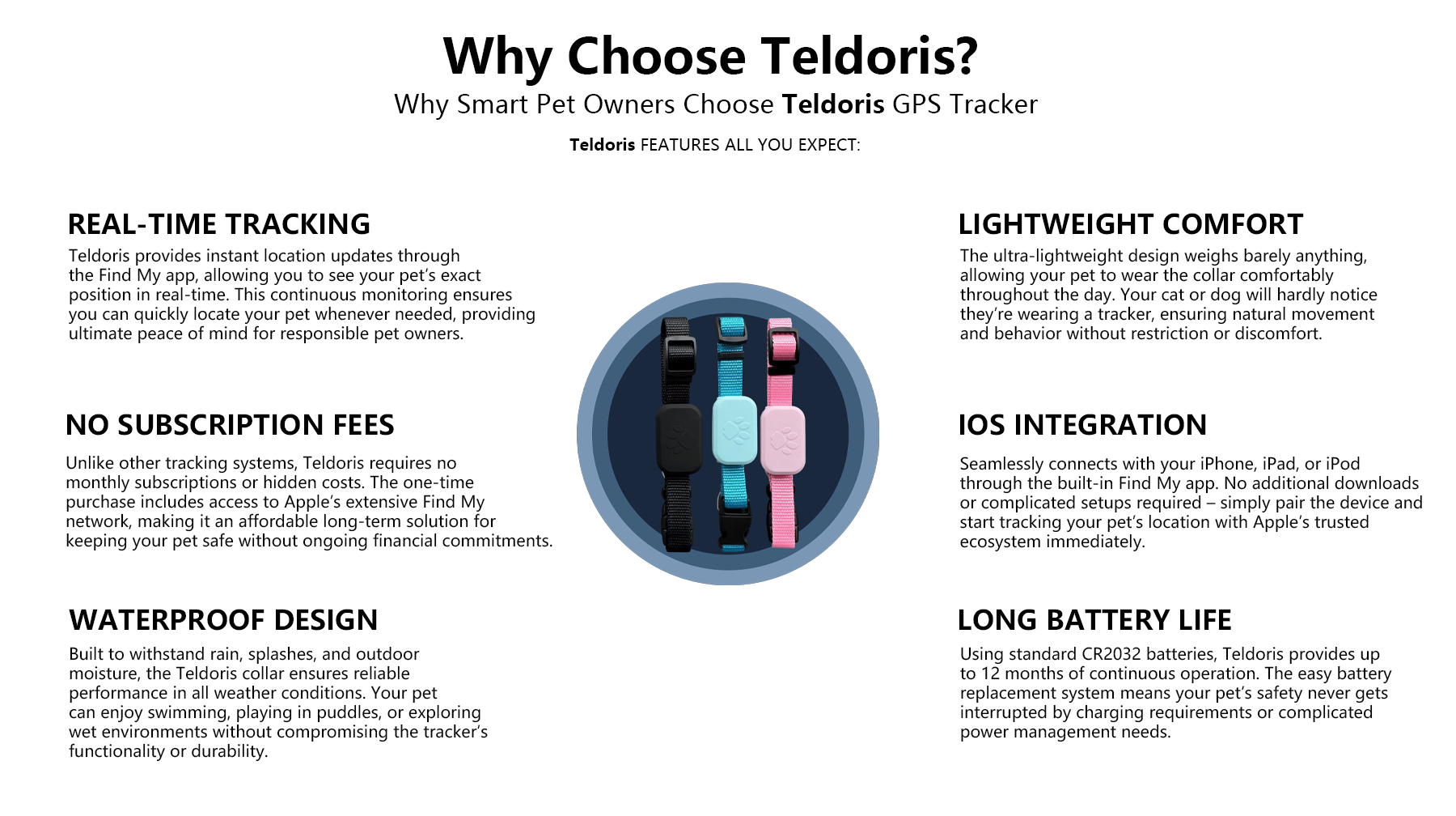 The Teldoris GPS Tracker provides reliable, real-time location updates through the Find My app, ensuring you always know where your pet is. Its seamless iOS integration means no complicated setup – just peace of mind knowing your furry family member is safe and secure at all times.